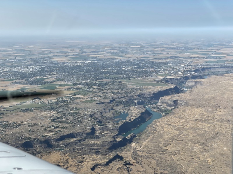 The plan today was to get as close to Seattle as possible, but a stationary front was creating a lot of IMC up in the Seattle area, with low freezing levels. Initially I considered going north from Yellowstone to the Missoula, Montana area, and possibly up to Glacier National Park, but clouds and low-ish ceilings were going on up in the Missoula area, so decided going a bit SW through Idaho was the best plan. I was also keen to get out of the mountains as soon as possible to give us more options. After a brief search, Twin Falls, Idaho had cheap fuel and a crew car, so that became the lunch and re-plan stop. West Yellowstone was the highest altitude airport of the trip (around 6700 ft MSL), but cool temps meant DA only around 7000 for our departure, so there were no real performance problems. Climbed to 10,500 feet for our westbound flight, which went very quickly since we were starting very high already. It was a very easy flight with no real weather or traffic concerns, and I decided we would make a small diversion to overfly the Craters of the Moon National Monument. Heading into Twin Falls, we had a great view landing over the falls, which were more impressive than expected. Grabbed a crew car, the desk staff was very friendly and suggested we drive to visit the Shoshone Falls. We also grabbed some more excellent BBQ in town, and played a bit of toss with Magic in the city park.