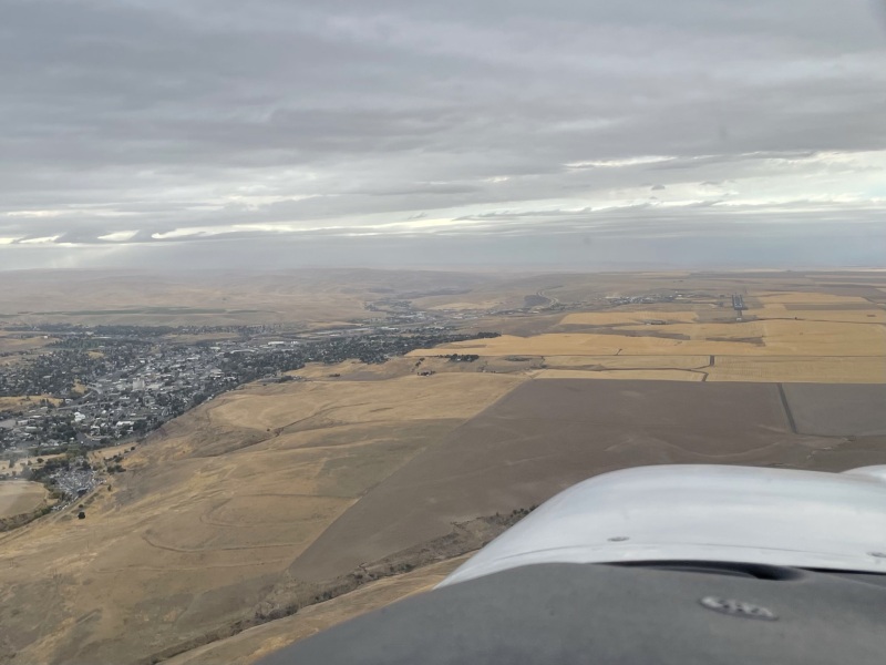 After lunch, I decided the weather to get to Seattle was a definite no-go (freezing levels as low as 5000 ft MSL, lots of overcast/broken layers, and 9000 ft MEAs to get into the area), so I decided the furthest we could go was Pendleton, OR, which still had good VFR and was forecast to stay that way until the evening. Departed TWF VFR with flight following and headed northwest. Overflew Boise, Idaho and Mountain Home, Idaho. We had great VFR and clear skies all the way until 20nm or so from PDT, but it was looking very very sketchy ahead. Clouded all through the valley that crosses the mountains into Pendleton. At 8500 MSL, I looked at my OAT gauge and saw it was still 6C and consulted the charts to get into PDT. I only needed to get to 9000 to get over the mountain and 7000 ft to join the approach, so I decided going IFR was safe enough. The field was reporting MVFR with moderate ceilings, but the landing itself might be a challenge, since it turns out Pendleton regularly gets quite strong East-West winds, and the winds were gusting from 20-30 knots, more or less down the runway. Ultimately I decided it was safe enough. Asked for and got a popup IFR, got a 500 foot climb over the mountains, entered IMC, was cleared for the approach at 9000 ft, flew a pretty simple (but extremely steep downhill) RNAV, and broke out around 1000 AGL and made an easy landing in Pendleton. Pendleton itself is in the more desert-like eastern part of Oregon, so it was mostly flat and featureless coming into to land, once we got past the mountains. We spent a couple nights here, mostly just walking around the town. It turns out Pendleton is known for a major rodeo (the Pendleton Roundup), but we had just missed it by 2 weeks. But the town is filled with monuments to the rodeo and other cowboy type things. Fortunately, Pendleton was cheap to stay in and even had the "App Scooters", so I was able to rent scooters to get around and get us food. Pendleton also did have a river walk and a fairly nice city park, which Magic enjoyed.